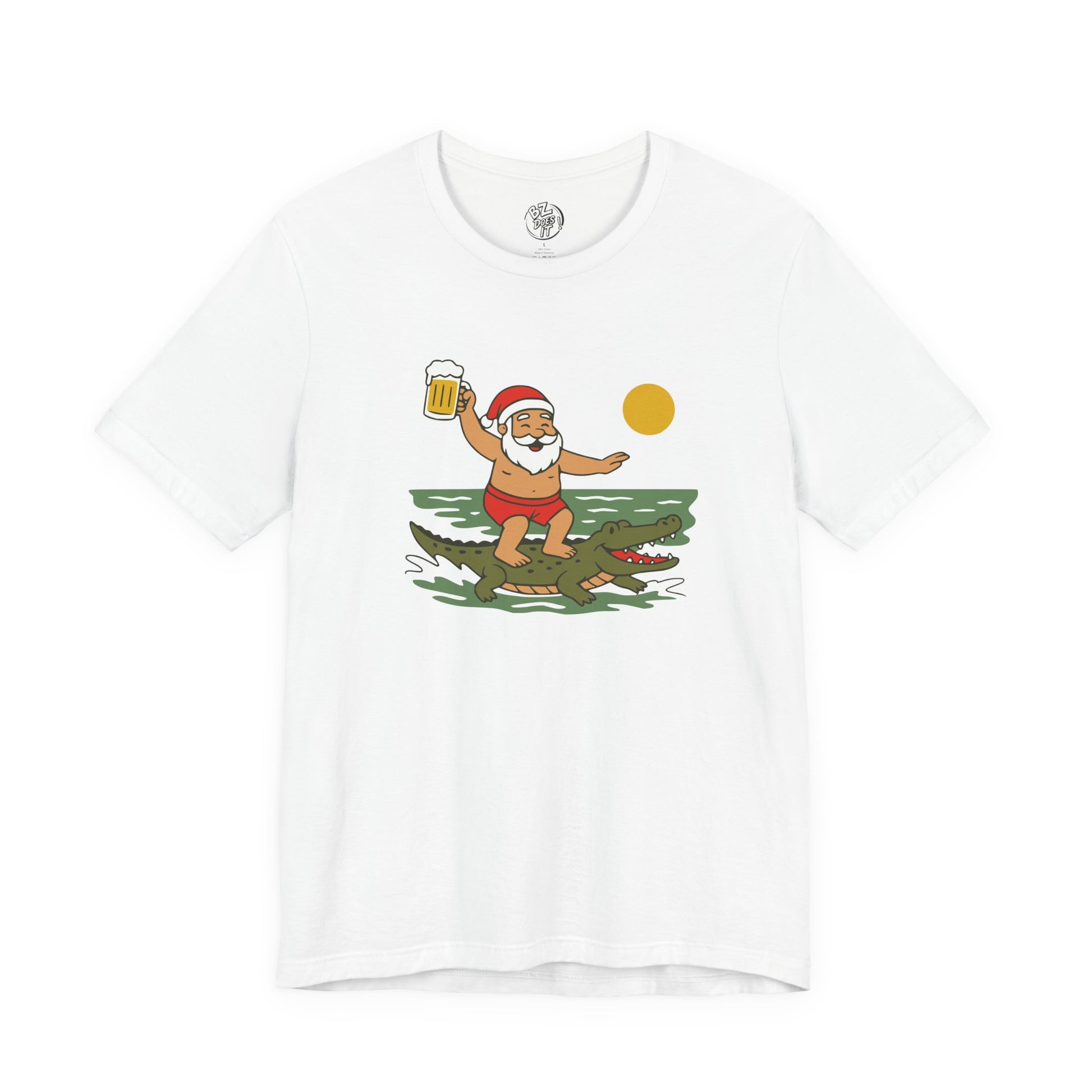 A festive and fun T-Shirt featuring Santa riding a gator, with beer and beach elements, perfect for Christmas and holiday celebrations. The design exudes a laid-back and cheerful vibe, making it ideal for those who enjoy a quirky and unique style. This T-Shirt is relevant to adult buyers looking for a playful twist on traditional holiday attire.